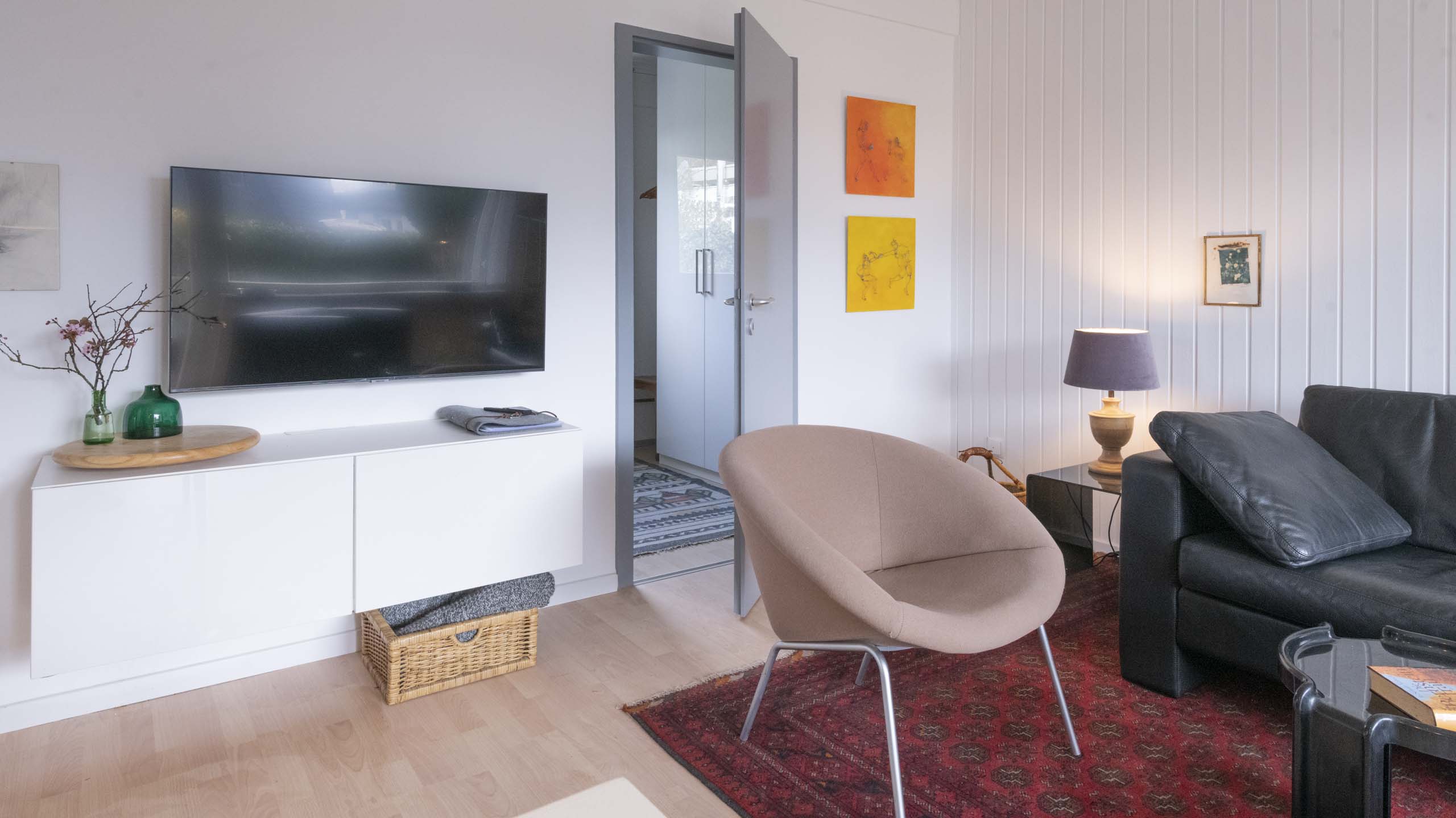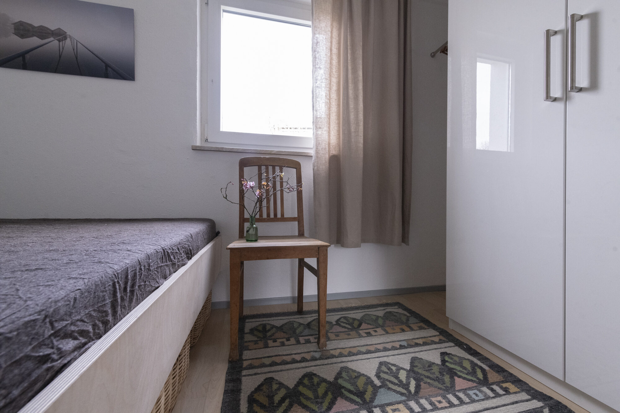 Zugunsten des Wohn- und Essbereichs sind das Badezimmer mit Dusche und WC sowie die zwei Schlafzimmer relativ klein. Das Elternschlafzimmer ist mit einem Doppelbett und einem großen Schrank, das Kinderschlafzimmer mit zwei dänischen Einzelbetten bestückt, unter denen mehrere schöne Weidenkörbe auf die sommerliche Feriengarderobe warten.